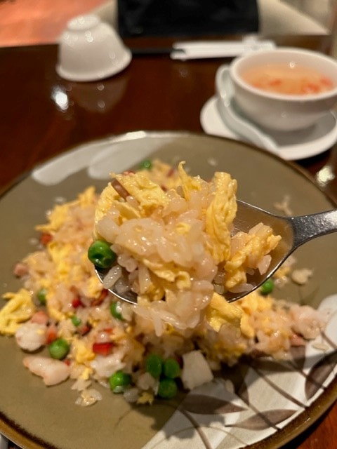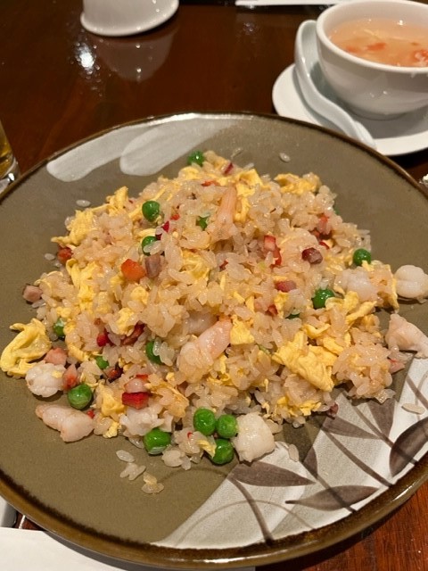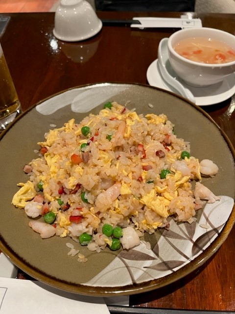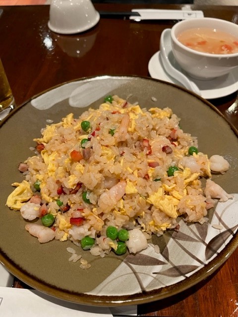 「赤いチャーシューと黄色い卵と緑のグリーンピースと海老のうすいピンクとご飯の色・・・・この彩り、色とりどり、これは五色以上の色合いが混ざり合って、完璧な配色バランスだよね、これぞ中国4000年の歴史が生み出す調和の色合いだよね、凄い!(*゚Д゚艸)」