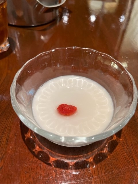 「あ、お姉さんが杏仁豆腐持ってきてくれたぁーーーー、ちょうど陰陽五行の話してたら紹興酒飲み終わったぁーーーシェイシェイ♪謝謝♪(´∀`人)甘くて、サッパリして美味しい( *´艸`)」