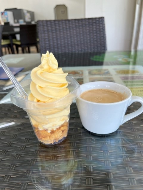 エアコンが効いているレストランで涼みながらマンゴーソフトクリームとコーヒーで休憩休憩 (人-ω-)おやすみなさい って、居眠りはいかん、レストランでぇーーーー( ´Д)=○)3´)・∵.ドガッ