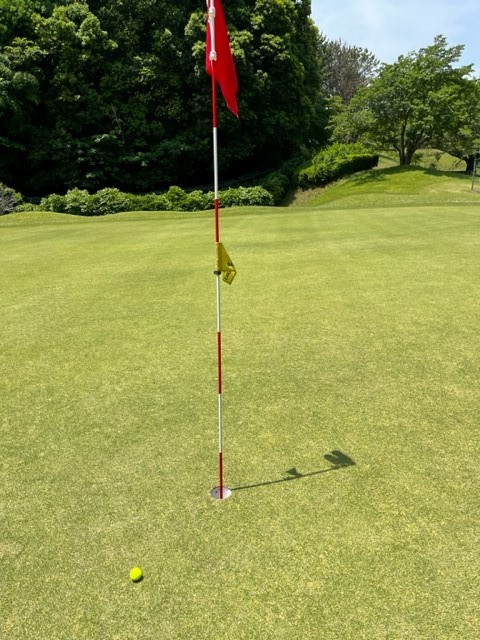 Par3で「祇園精舎の鐘の声、諸行無常の響きあり。裟羅双樹(しゃらさうじゅ)の花の色、盛者必衰のことわりをあらはす。おごれる人も久しからず、唯(ただ)春の夜の夢のごとし。たけき者も遂にはほろびぬ、偏(ひとへ)に風の前の塵に同じ」を音読しながら、ゴルフボールを打ち続けること、5オンの2パットで7点・・・・・・(ノД`)・゜・。