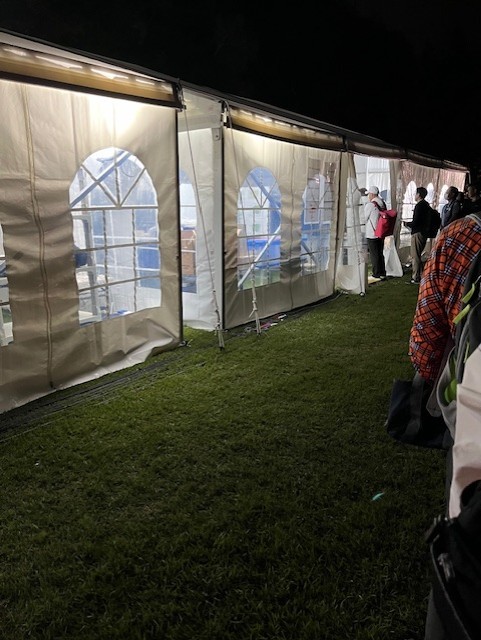 バスをおりて、まだ真っ暗な空の下を少し歩いてボランティア本部につくと、テントが幾つかあり業務内容ごとにわかれているそうなので、寅が今回アサインされたお仕事が「ホールマーシャル(ボランティアお仕事紹介 – Golf Park ゴルフパーク)」だったので、そちらのテントの受付の列に並ぶも、人いっぱい オオォォ∑(´▽`ノ)ノ