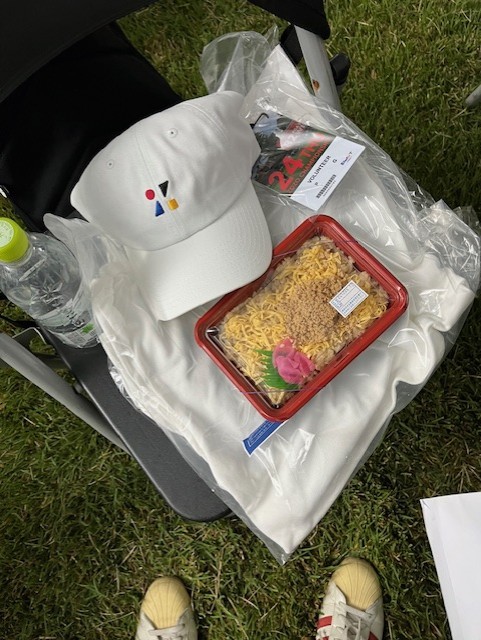 そして、自分の番がやってきて、受付を終えると、スタッフとして業務するための帽子とポロシャツとウィンドブレーカーとIDをもらい、さらに、なんと、まったく期待していなかった朝ごはんのお弁当までもらったぁあああああああああああイェ────v( ´∀` )v────ィ