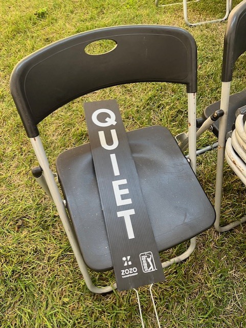 そして、とうとう48番が呼ばれて、アサインされた今日のお仕事は「3番ホールティーグランドのマーシャル」で2番ホールのグリーンとすぐ近くなので、2番ホールのグリーンのマーシャルのお二人とうまく連携して、トイレや食事休憩などに行ってくださいとのことなので、2番ホールご担当のお二人のオジサマにご挨拶の後、備品である「QUIET」ボードと椅子を持って・・・・ ドキドキ((〃゚艸゚))ドキドキ