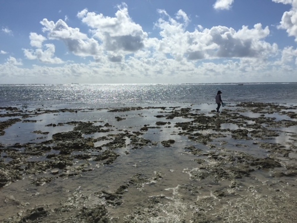 寅も一度久高島のイシキ浜でぼーっと海を眺めていたら、ちょうど干潮で、潮がひいたあとのサンゴ礁の上を、一人の女性が何か魚介類があがってないかと探して歩いている光景を見たことがあるのです、あ、今、文章書きながらスマホみてみたら写真があったぁーーー( *´艸`)