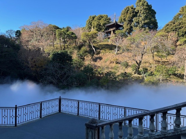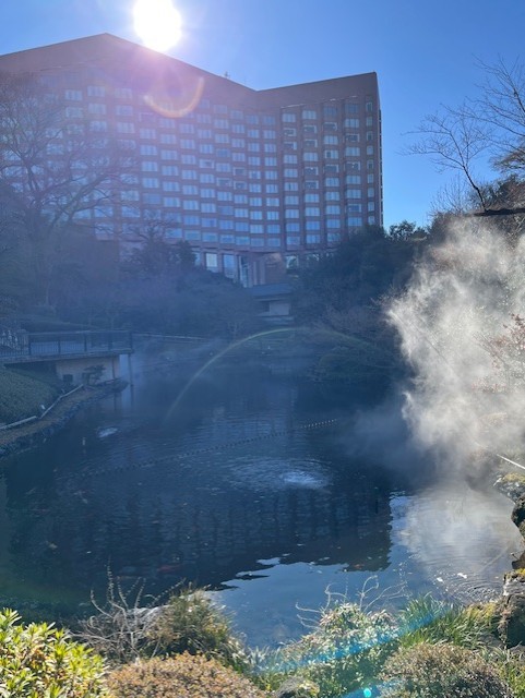 お庭のお池の前に来るとちょーーーーーど始まったぁーーーーーーー、東京雲海の演出ぅーーーーΣ(・ω・ノ)ノ!
